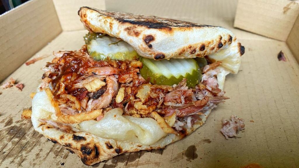 Adam and Maggie also like to do collabs with other pop-ups and creators, such as the BBQ/pizza mash-up they’ll host with Jorkin’ Joels. In this case, they employ their wonderfully fluffy, chewy dough as sandwich bread, folding it over to create a pizza pocket and stuffing it with smoked pork or brisket with pickles and fried onions. It’s a heavenly combination that makes one wonder why pizza BBQ sandwiches aren’t a wildly pervasive food.